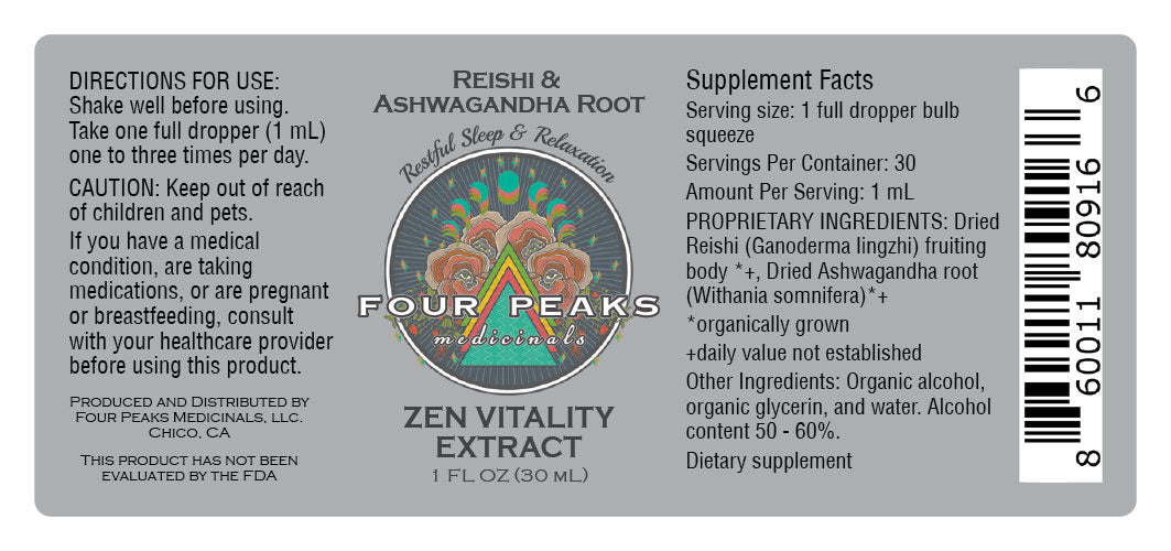 The Zen Vitality Extract Blend is a harmonious combination of Reishi Mushrooms and Ashwagandha, designed to promote relaxation, good sleep, balance and vitality.