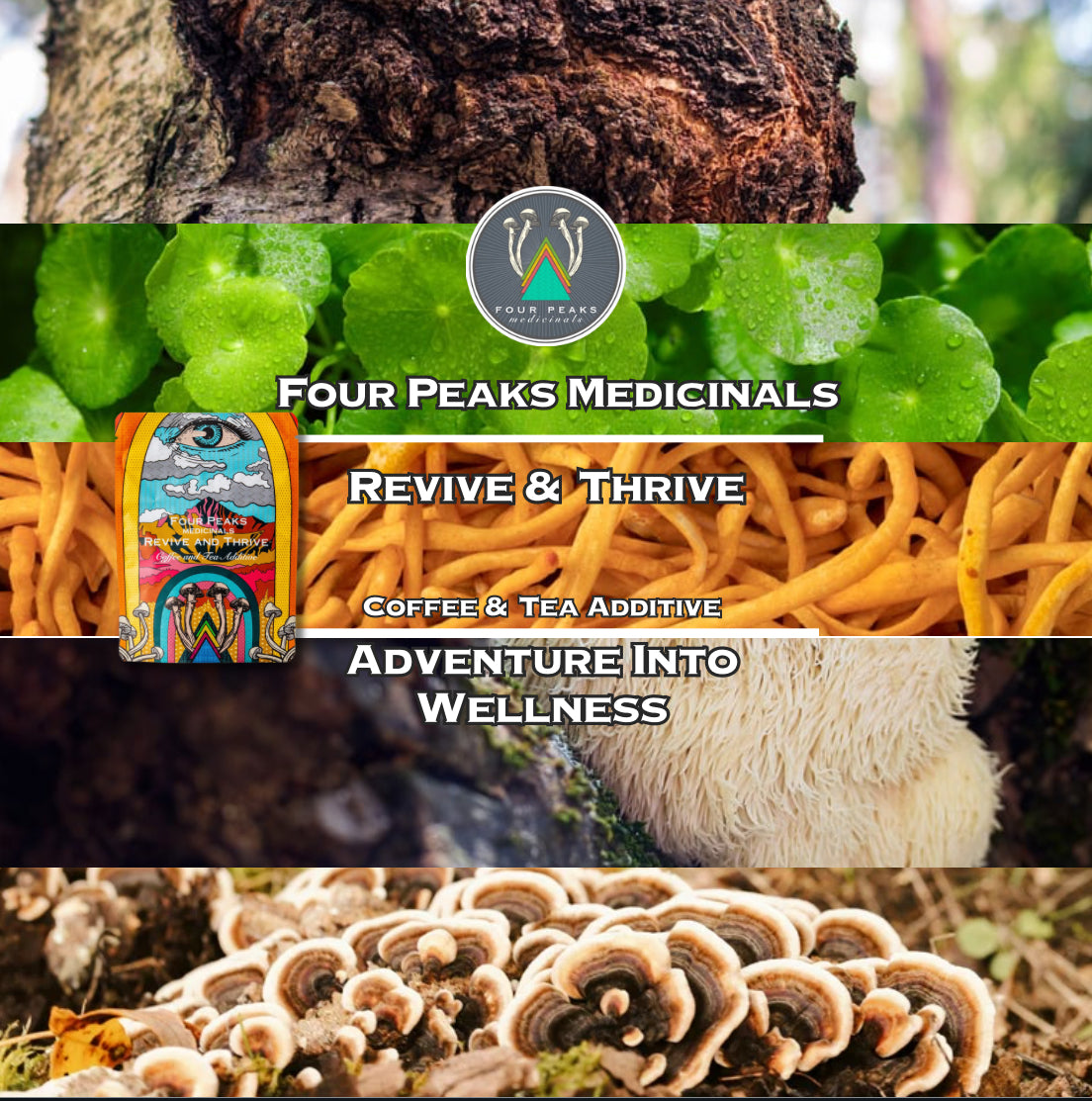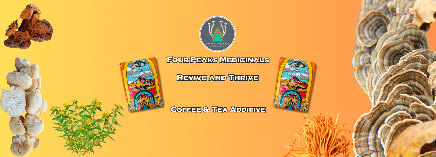 Four Peaks Medicinals, Revive and Thrive Blend is made with Turkey Tail, Lion's Mane and Cordyceps Mushrooms and Rhodiola