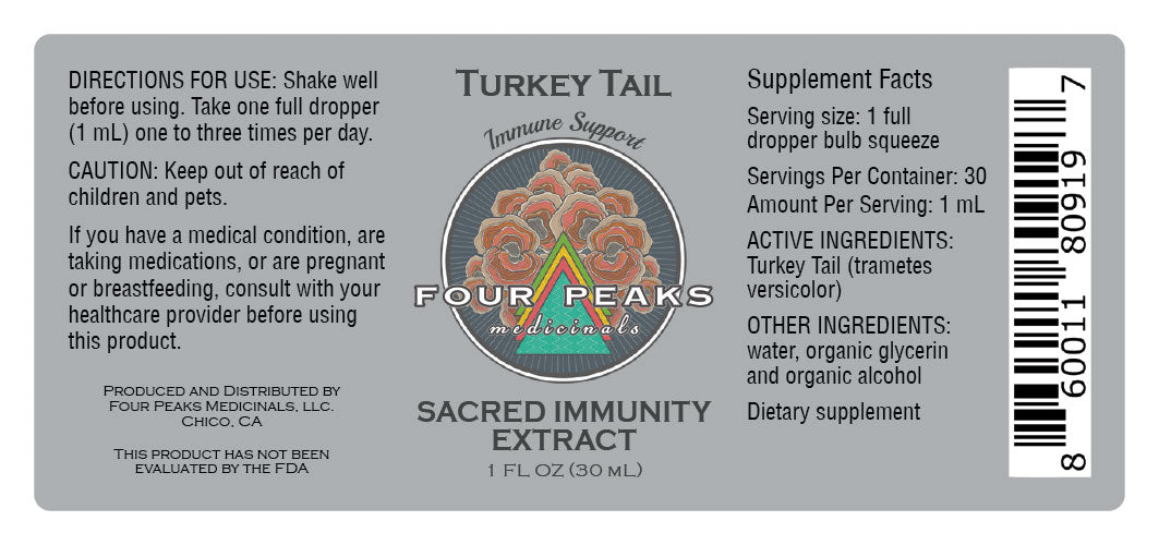 The Sacred Immunity Extract Blend features Turkey Tail mushrooms, a powerful natural ally for immune support and overall vitality.